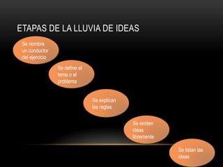 Es más a muchas personas que se encuentran en un entorno. Generar tantas ideas como sea posible durante la sesión. 1 Definición de lluvia de ideas.